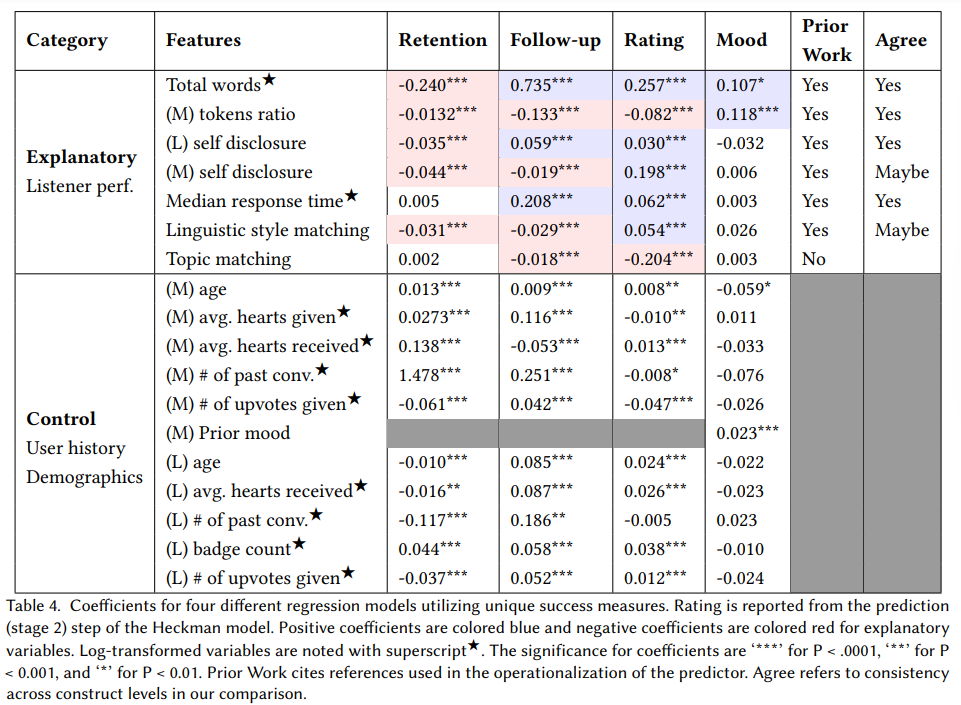 Triangulation of key success outcomes is valuable for online platforms because multiple outcomes provide a comprehensive overview of user engagement, and has been leveraged in digital user experience, human factors, medical informatics, and healthcare quality for designing and evaluating products. In the related area of predicting mental health states from social media data, Ernala et al. Previous work has suggested triangulation of diagnostic signals for predictive models to remedy issues in the validity and contextualization of predictor variables. However, to the best of our knowledge, no studies have paid attention to triangulating outcomes in studying peer-counseling on OMHPs despite the large body of research in connecting success outcomes with users' behaviors in OMHPs.
